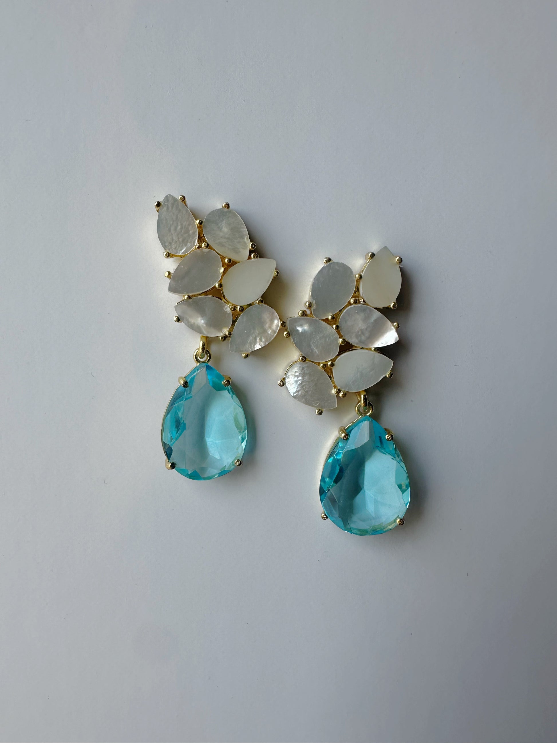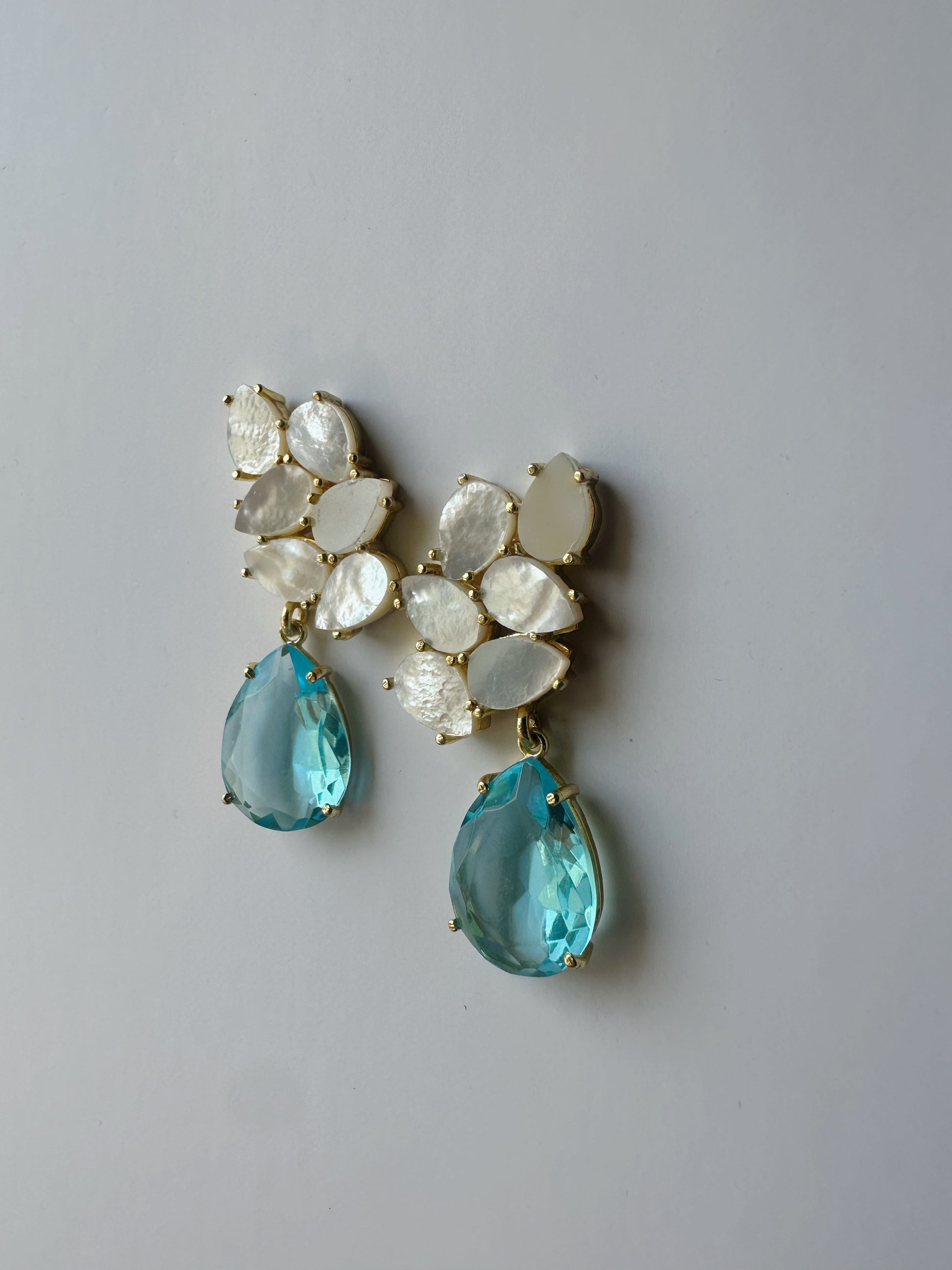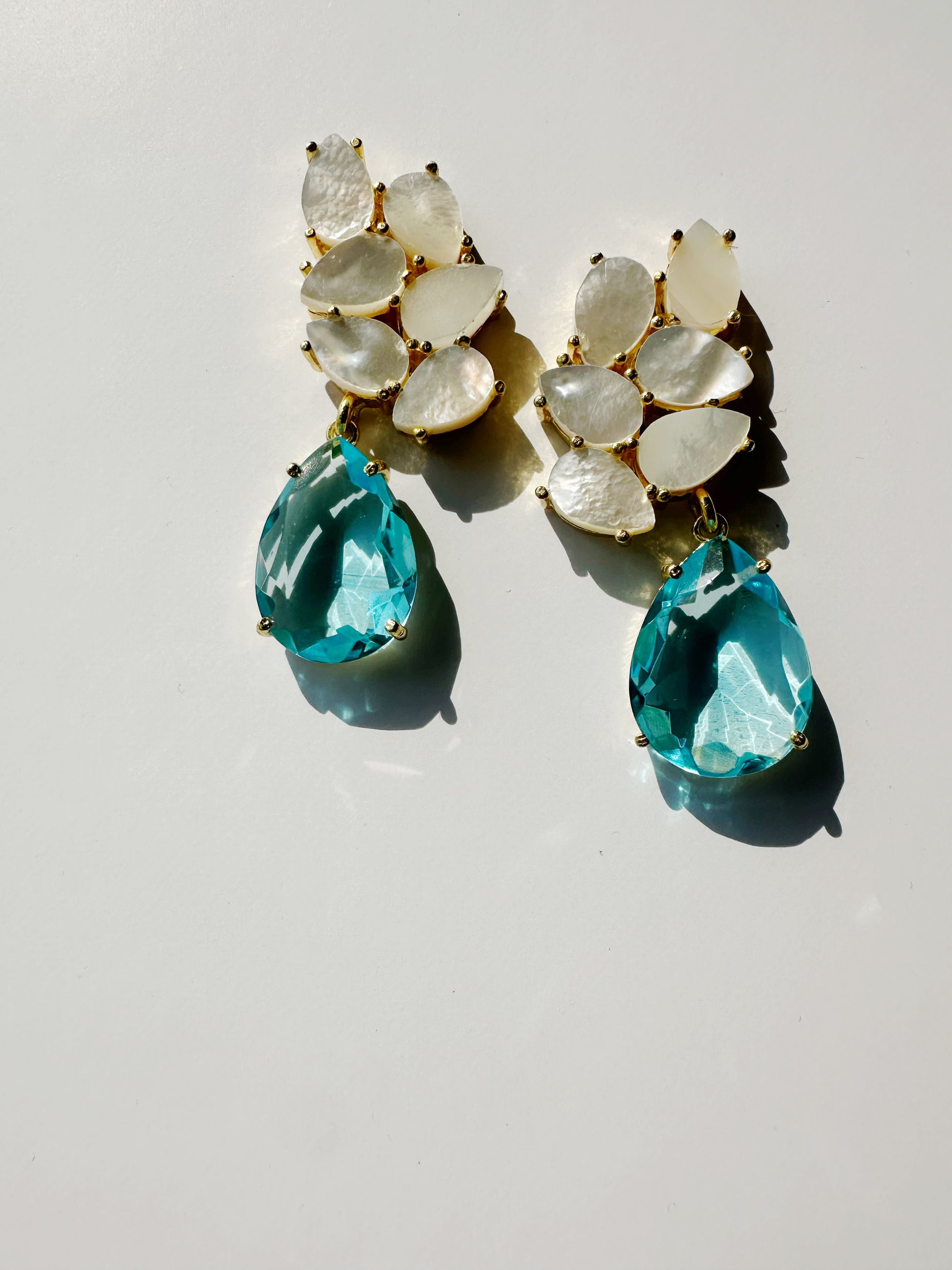Lulu earrings combine elegance and timeless charm, crafted from gold vermeil, luminous pearl shell, and dazzling blue topaz hydro gemstones.